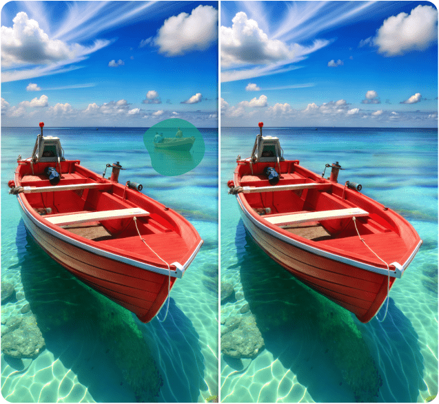 Whether an image is a photograph or AI-generated, objects can be seamlessly removed. Perfect your images with touch-ups.